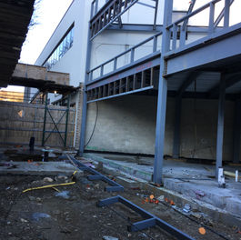 The structural framing consists of structural steel columns, beams and girders with a composite slab on metal deck second floor framing. The lateral system is comprised of steel moment frames. The roof structure is steel framing and metal roof deck. The foundations are cast-in-place concrete grade beams, pile caps, and structural slab spanning to the pile caps and grade beams. Cuono Engineering redesigned the foundations along the north wall of the new building to accommodate previously unknown conditions at the exterior of the adjacent structure that abutted the property line on the site.